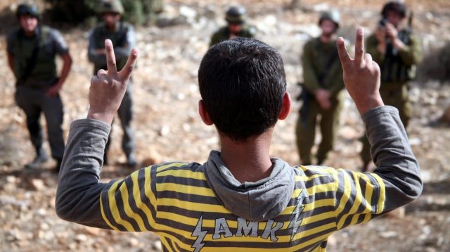 Seorang anak Palestina melambaikan tangan dengan tanda kemenangan di depan tentara Israel selama demonstrasi yang […]